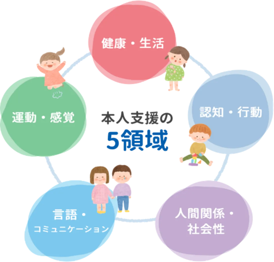 発達支援の中で、お子さまの成長や発達に関連する領域は、児童発達支援および放課後デイサービスのガイドラインにおいて5つの領域に分類されています。